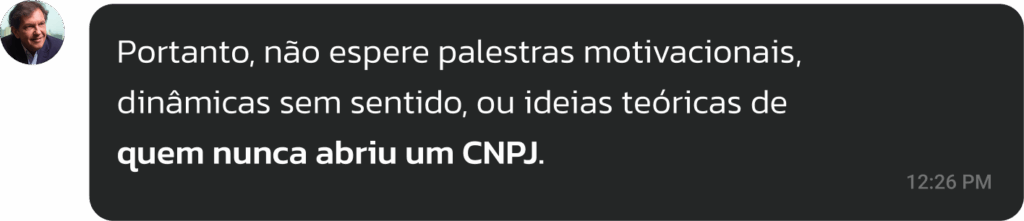 É um dia de imersão presencial, com foco prático e interativo. Não há palestras motivacionais ou dinâmicas sem aplicação prática.